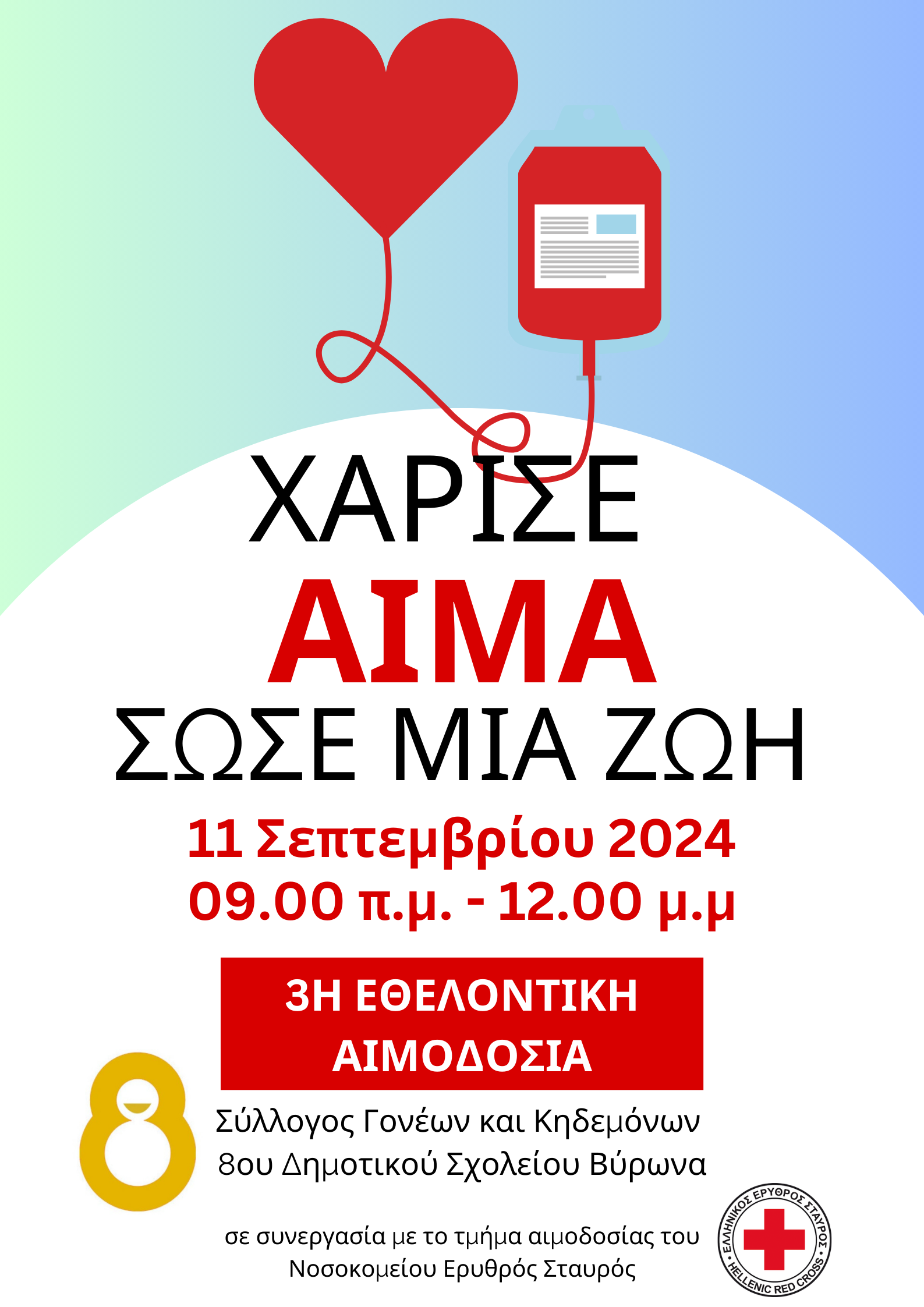 Θυμίζουμε πως η δράση αυτή έρχεται μετά την τρίτη αιμοδοσία στο σχολείο μας (11/9/2024) όπου δόθηκαν 10 φιάλες αίματος για την τράπεζα αίματος του σχολείου μας. Κατά την 2η αιμοδοσία (1/4/24) είχαν συγκεντρωθεί 17 φιάλες αίμα από 21 ενήλικες/ γονείς. Η πρώτη αιμοδοσία είχε γίνει στις 27 Οκτωβρίου 2023, 8:30 – 13:00, 6 μήνες πριν, σε μία περίοδο (μετά το καλοκαίρι) που οι ανάγκες για αίμα ήταν αυξημένες. Σε εκείνη την πρώτη προσπάθεια είχαν συγκεντρωθεί 19 φιάλες αίμα, από 21 ενήλικες/ γονείς.