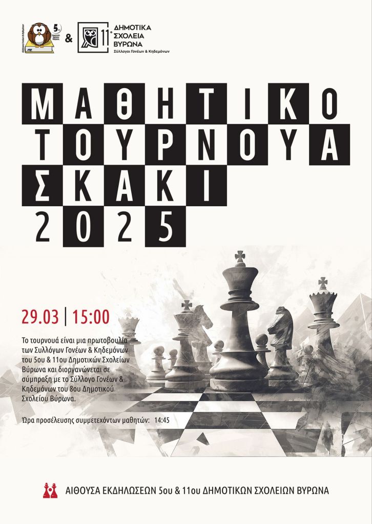 Το Σάββατο 29 Μαρτίου και ώρα 3μμ στο χώρο των 5ου & 11ου Δημοτικών Σχολείων Βύρωνα (Αίθουσα Εκδηλώσεων), θα πραγματοποιηθεί το 2ο ΤΟΥΡΝΟΥΑ ΣΚΑΚΙ για μαθητές Δημοτικού.