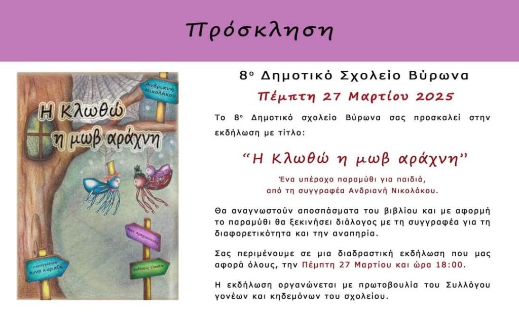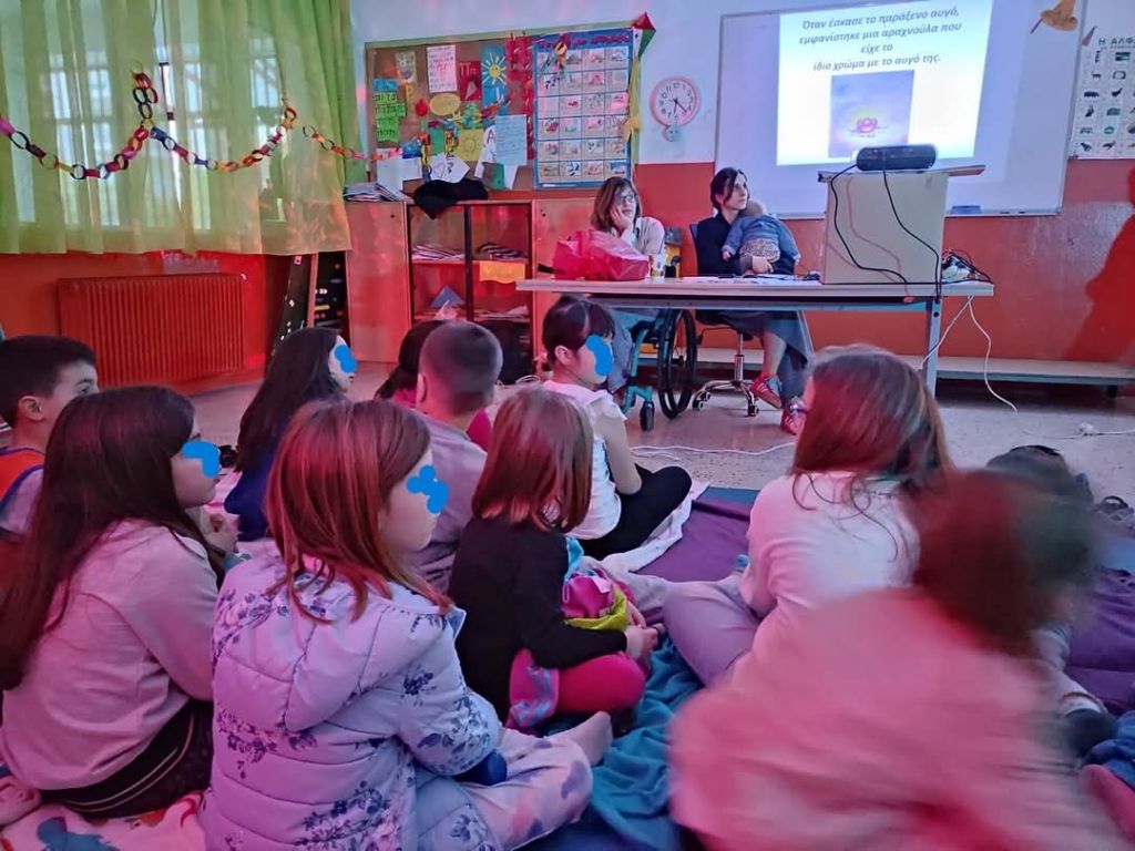 Ευχαριστούμε ιδιαίτερα την κ. Λένα Κούτσικα για την υποδοχή στο χώρο που φιλοξενεί τη βιβλιοθήκη του σχολείου και την καλεσμένη μας συγγραφέα, κ. Ανδριανή Νικολάκου για την τιμή που μας έκανε να μας επισκεφθεί, να μας συστήσει και να μας δωρίσει το βιβλίο της και να συζητήσει με τα παιδιά τη διαφορετικότητα και την αναπηρία.
